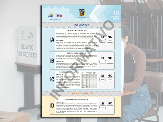 Ecuador | El Pleno del Consejo Nacional Electoral (CNE) aprobó, este 5 de octubre, la actualización de diseños del material electoral, documentos y papeleta que serán utilizados en el Referéndum y Consulta Popular 2025, que se llevará a cabo el domingo 16 de noviembre.