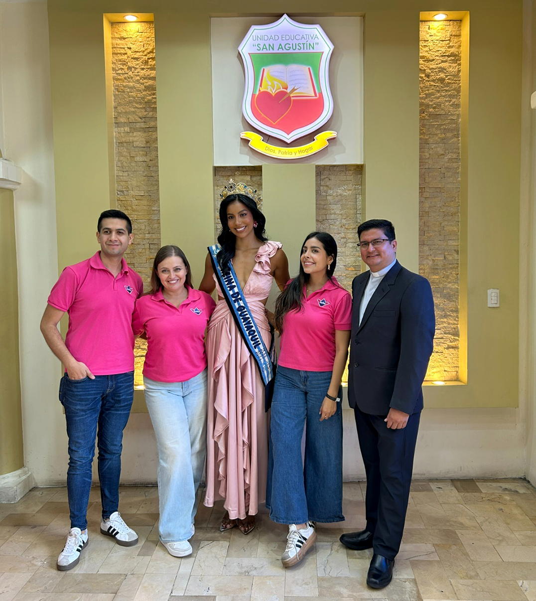 De izquierda a derecha: Guido Reveló, Coordinador de Categoría Nosotras; Paola Mena, Gerente marca Nosotras; Jenniffer Tutivén, Reina de Guayaquil; Soledad Vela, Coordinadora de marca; Padre Fray Wilson José Posligua, Rector de la Unidad Educativa San Agustín