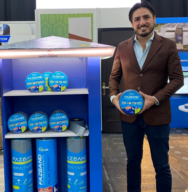 Mauricio Beltrán, Desarrollador de Negocios de Saint Gobain Imptek junto a Fazband, la cinta multipropósito diseñada para brindar aislamiento acústico, impermeabilización y fijación en proyectos de construcción liviana y tradicional.