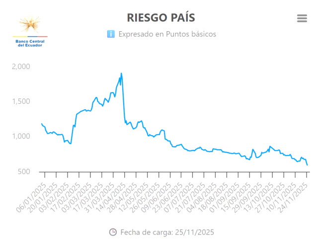 Ecuador | En las últimas semanas, el indicador de riesgo país de Ecuador registró una reducción sostenida, ubicándose alrededor de los 595 puntos, el nivel más bajo desde mediados de enero de 2025, de acuerdo al último reporte de noviembre de este año. Esta caída representa un síntoma de mayor confianza por parte de los mercados internacionales, luego de un 2024 marcado por inestabilidad política, tensiones sociales y desafíos económicos.