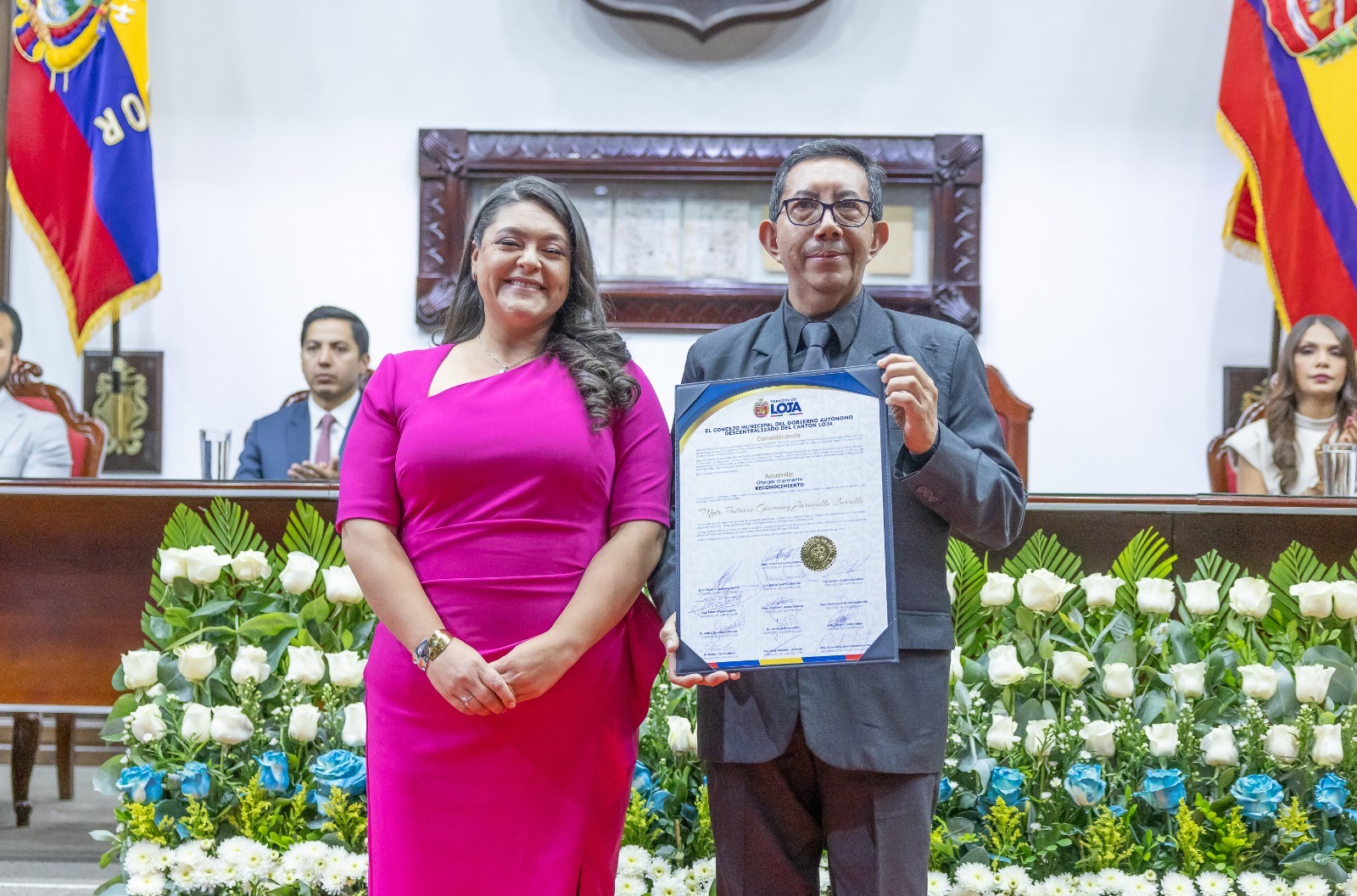 En el marco de la sesión solemne se hizo la entrega de reconocimientos a los ciudadanos que contribuyen al desarrollo social, cultural y económico de Loja, los que fueron aprobados por el Concejo Municipal de Loja.