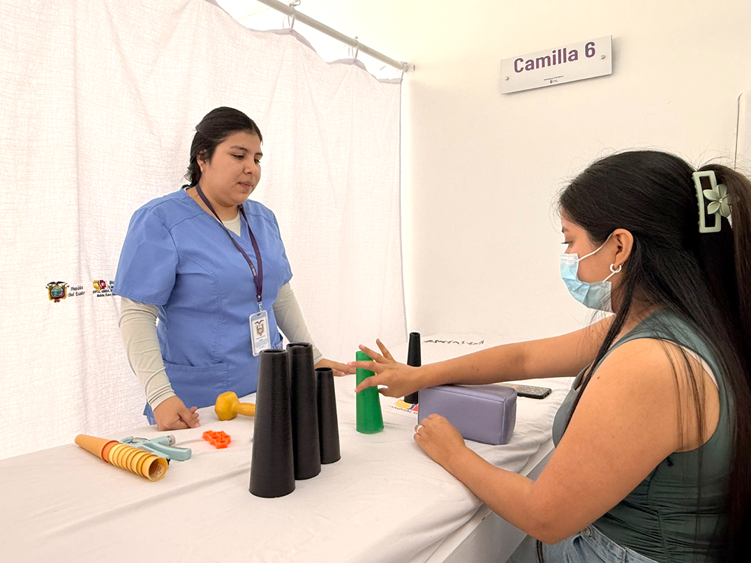 Seis fisioterapeutas y una especialista en Medicina Física y Rehabilitación conforman el equipo de profesionales encargados de atender a los pacientes derivados desde los Centros de Salud y Hospitales Básicos, así como aquellos que, tras intervenciones quirúrgicas realizadas en esta casa de salud, requieren un proceso integral de rehabilitación.